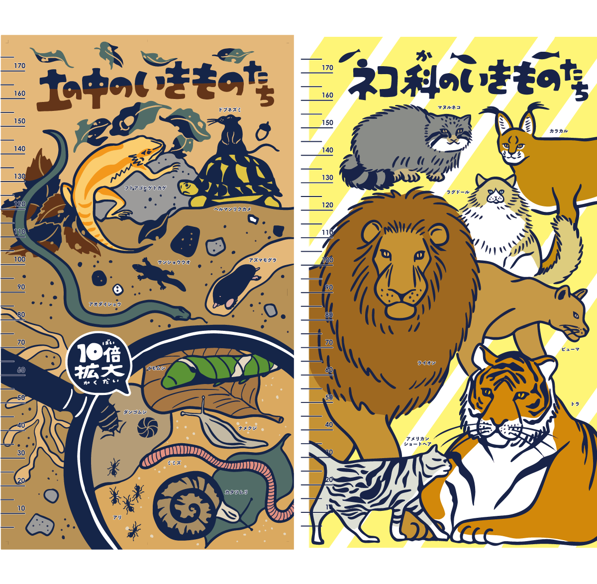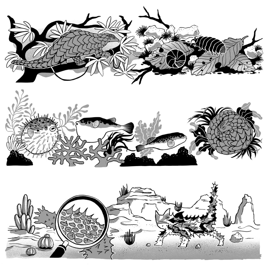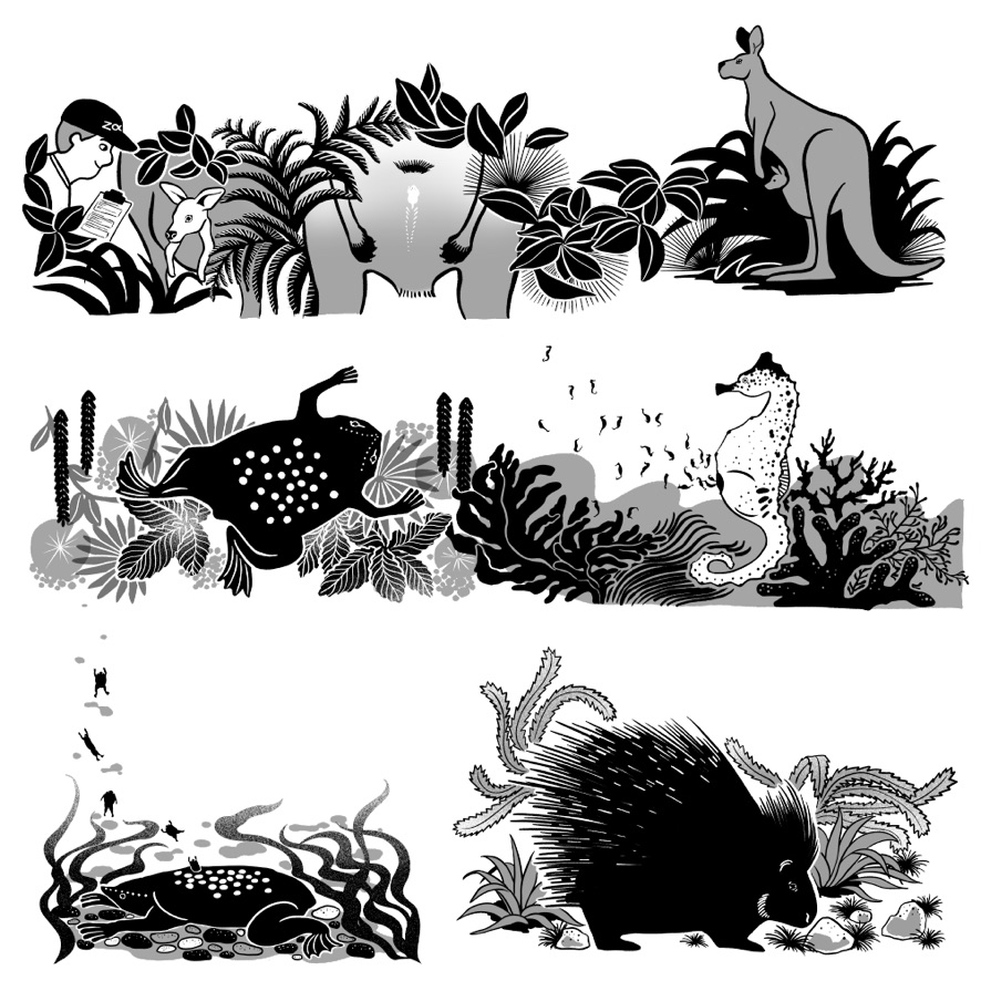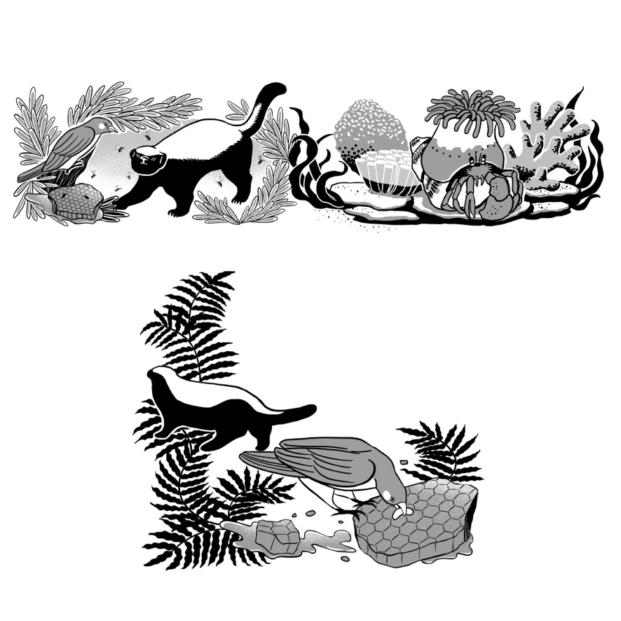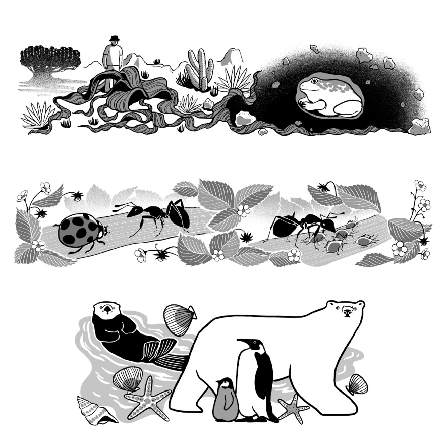 見開き2ページでつながっているようなデザインでのご依頼で、動物の住んでいる地域や環境に沿ったモチーフをちりばめて柄を作るような感覚で描きました。