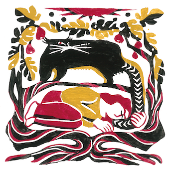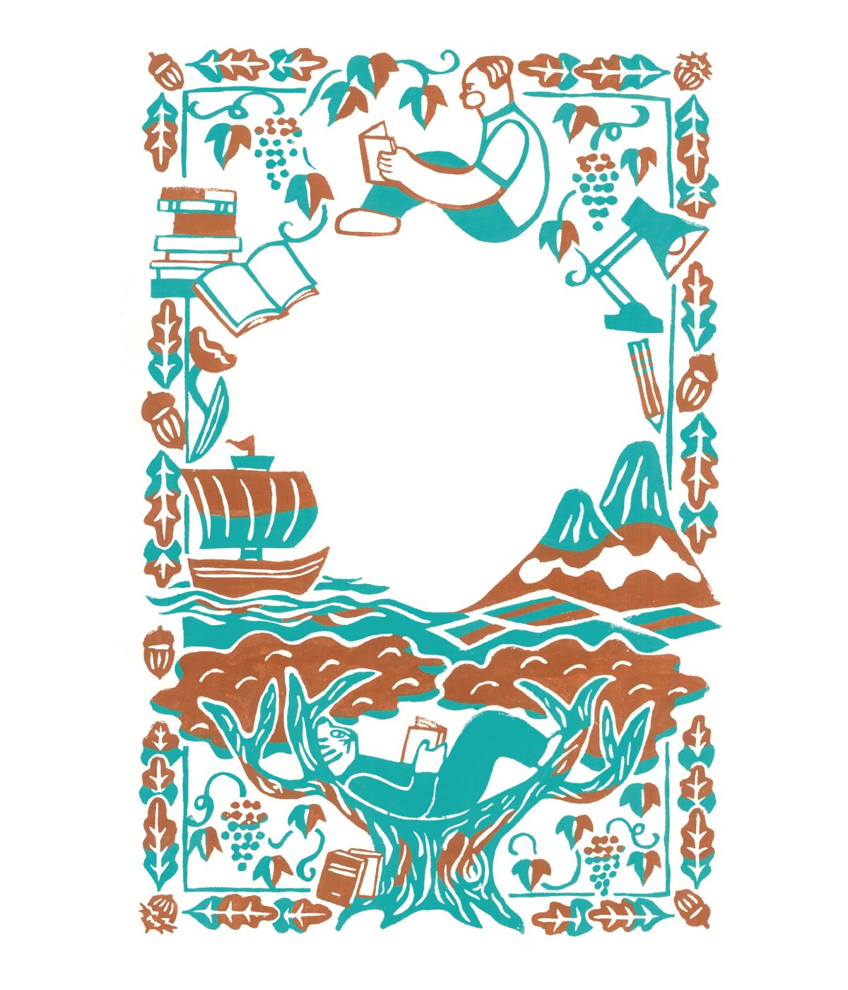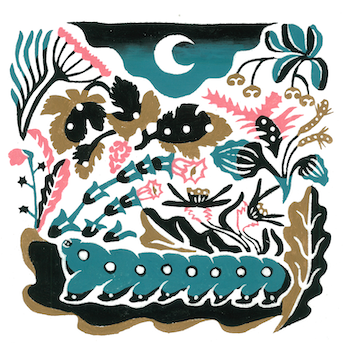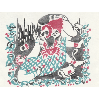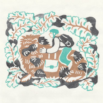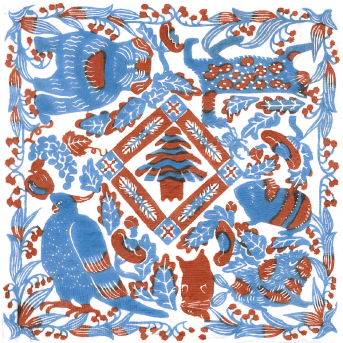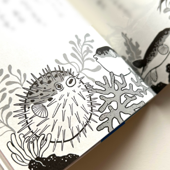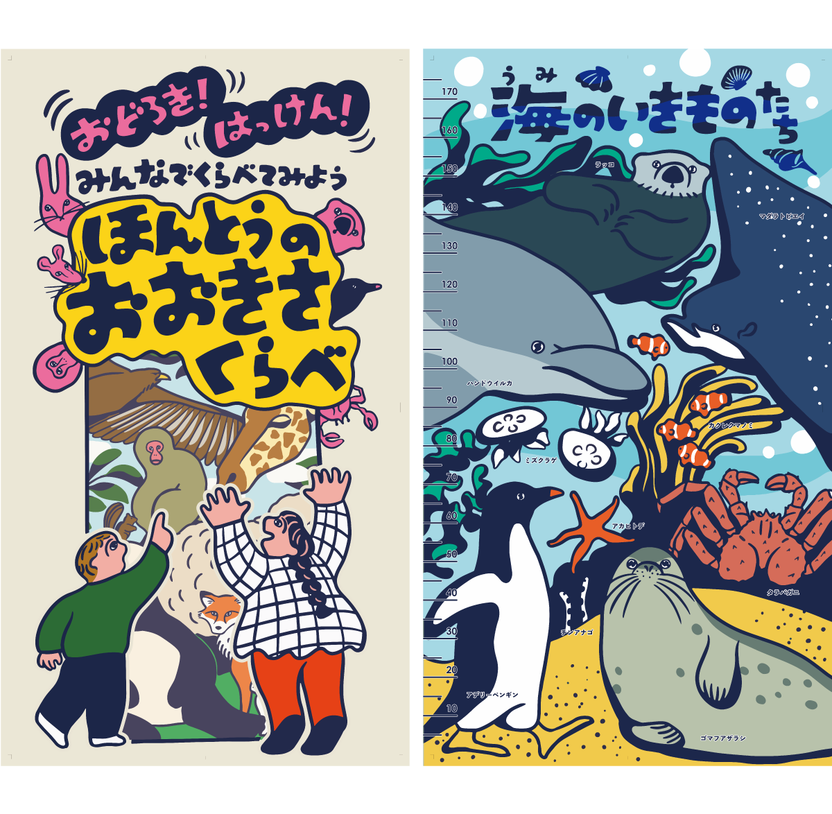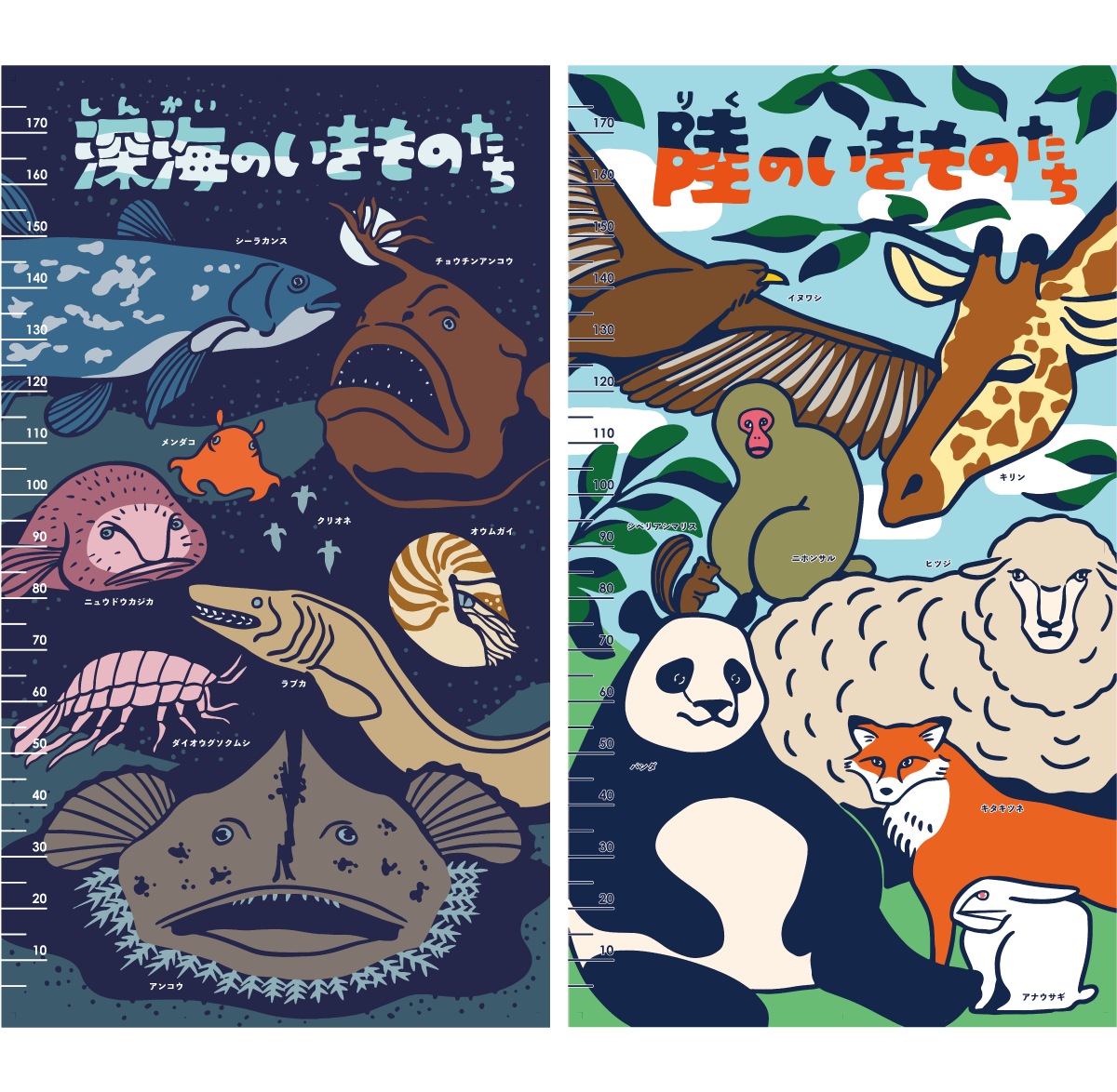 見開き2ページでつながっているようなデザインでのご依頼で、動物の住んでいる地域や環境に沿ったモチーフをちりばめて柄を作るような感覚で描きました。