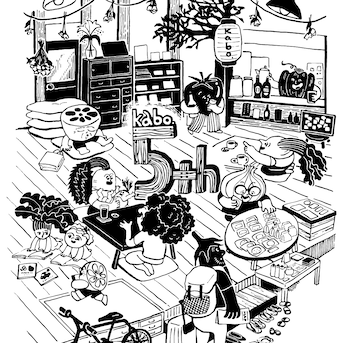 豊田市でゲストハウス・喫茶・レンタルスペース・委託販売をしているkabo.さんの5周年イラストを描かせていただきました。