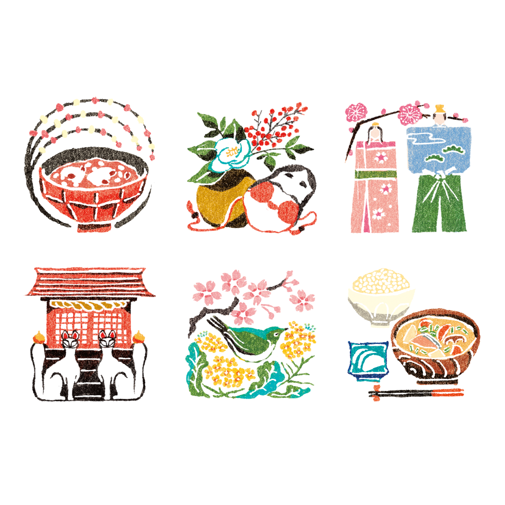 新年の縁起物や春のモチーフをたくさん散りばめました。